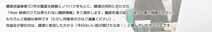 講師派遣業50年の豊富な経験とノウハウをもとに、講演の目的に合わせた「Web検索だけでは得られない講師情報」をご提供します。